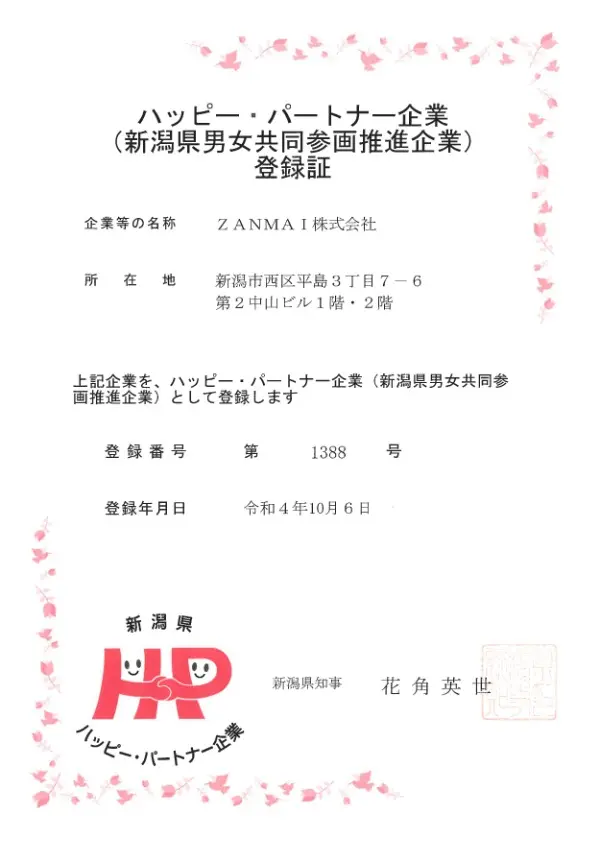 ZANMAI株式会社では、男女がともに働きやすく、仕事と家庭生活等が両立できるよう職場環境を整えたり、女性労働者の育成・登用などに積極的に取り組んでおり、新潟県による「ハッピー・パートナー企業(新潟県男女共同参画推進企業)」として登録されました。