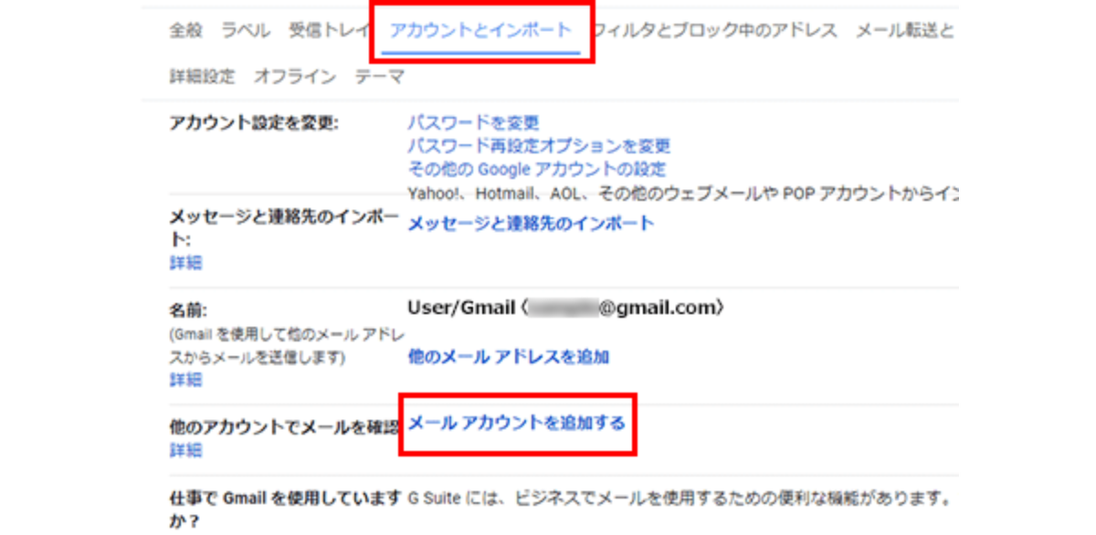 「アカウントとインポート」タブを選択し、 「他のアカウントでメールを確認」の項目から『メールアカウントを追加する』 をクリックしてください。
