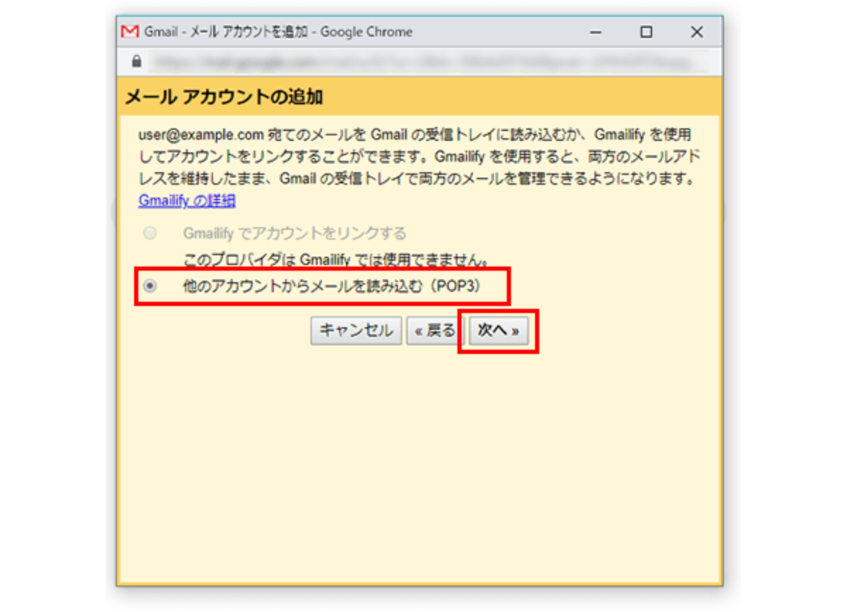 メールアドレスを確認し、「他のアカウントからメールを読み込む(POP3)」を選び、【次へ】をクリックしてください。