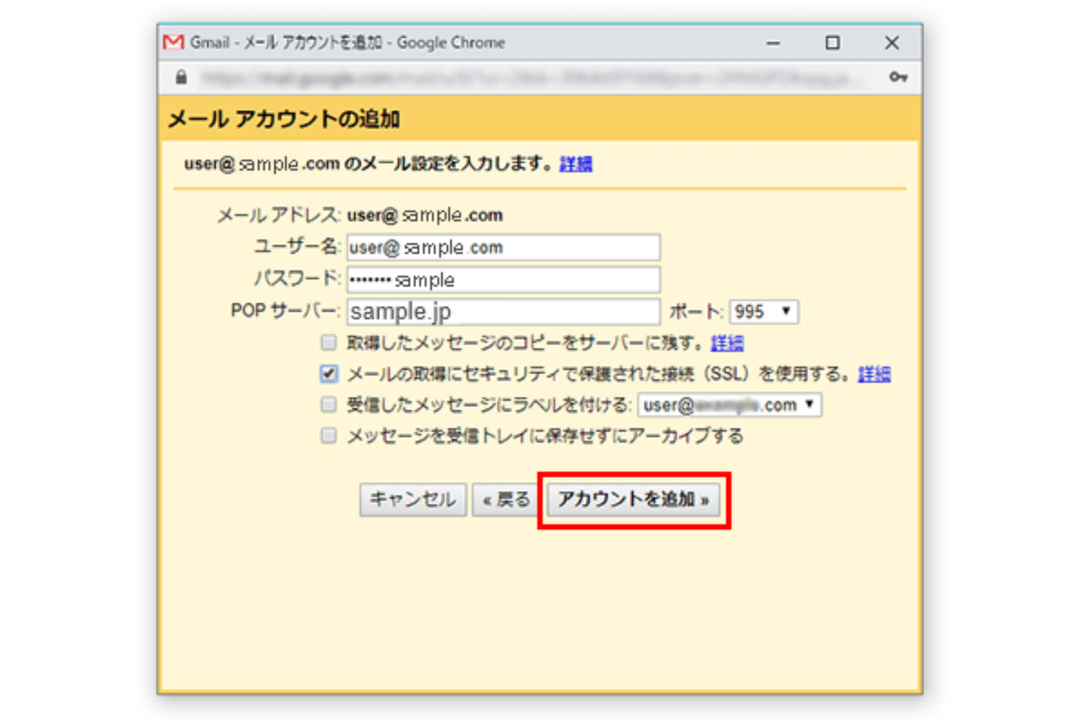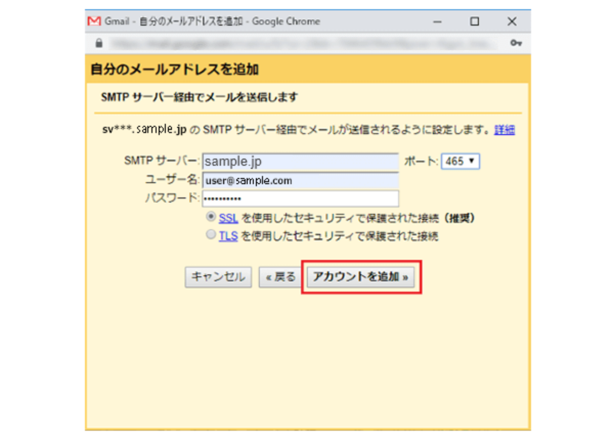 下記を参考に情報を入力し【アカウントを追加】をクリックしてください。