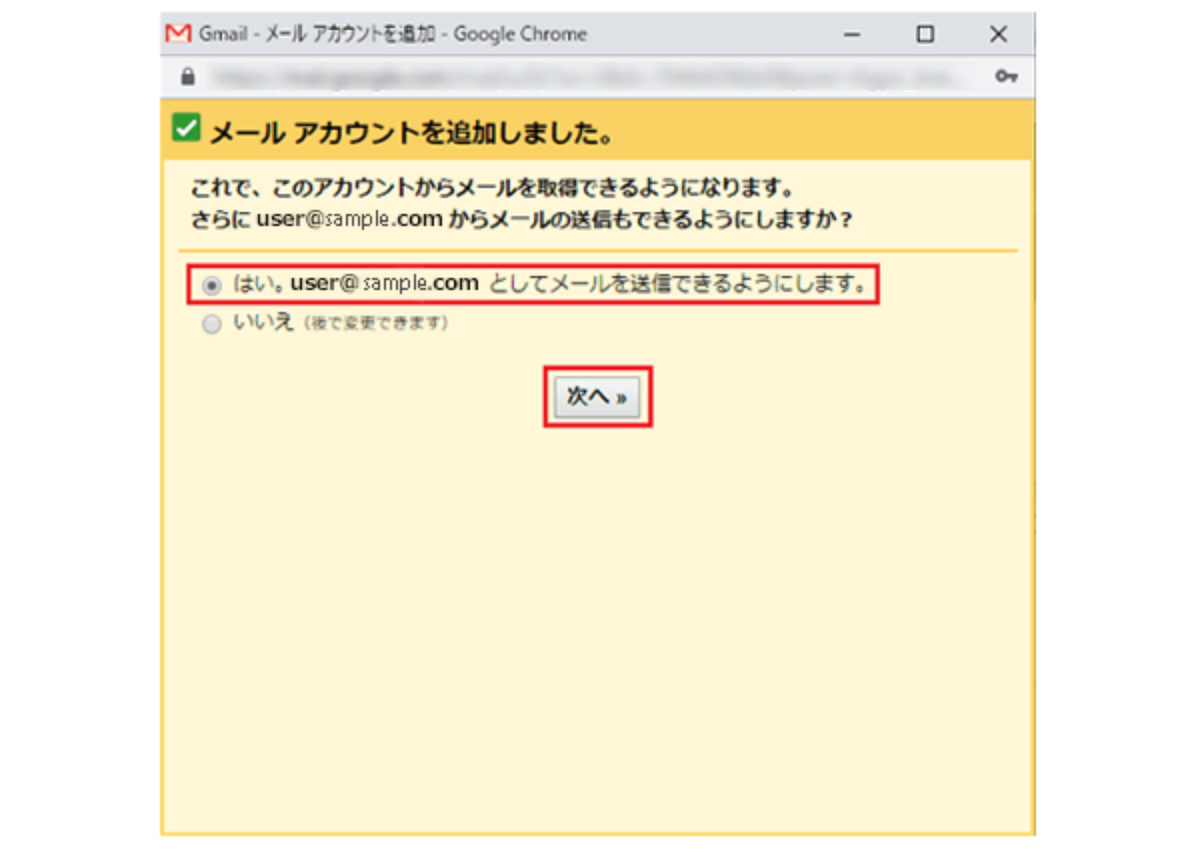 該当のメールアドレスでメールの送信も行う場合は 【はい。xx@xxxとしてメールを送信できるようにします】にチェックを入れ【次へ】をクリックしてください。