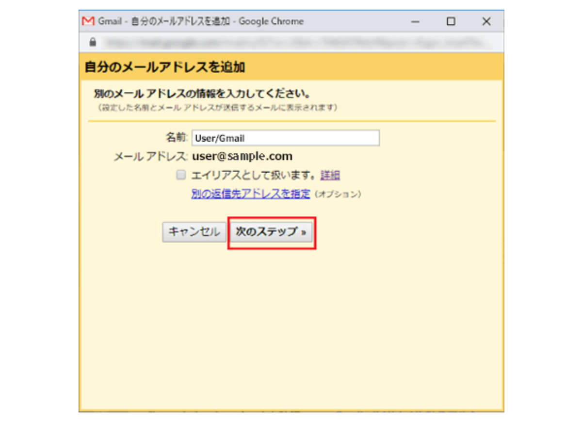 下記を参考に「名前」を任意で入力し、【エイリアスとして扱います】にはチェックを入れずに【次のステップ】をクリックしてください。