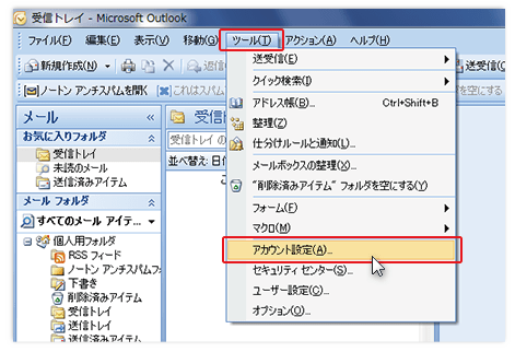 1 . 画面上部の「ツール(T)」より、「アカウント設定(A)」を選択