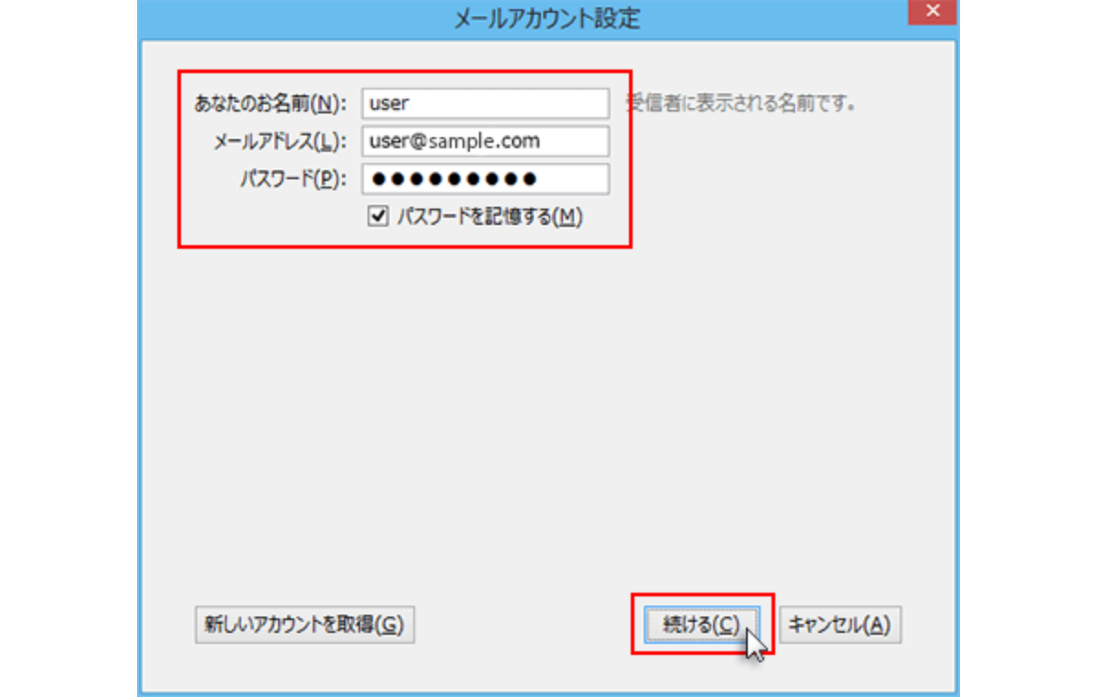 メールアカウント設定ウィンドウが表示されますので、[あなたのお名前][メールアドレス][パスワード]を入力し[パスワードを記憶する]にチェックを入れ「続ける」をクリックします。