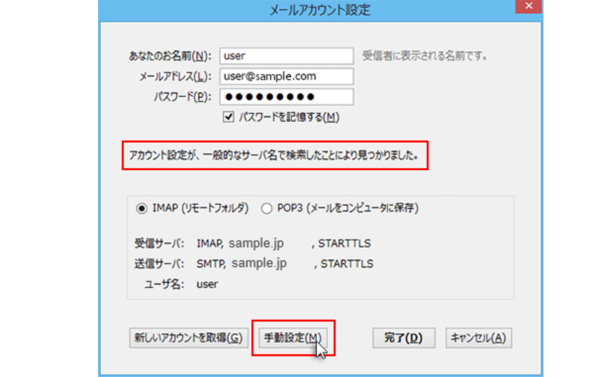 メールアカウント設定ウィンドウにて「アカウント設定が、一般的なサーバ名で検索したことにより見つかりました。」と表示されますので、ウィンドウ左下の「手動設定」をクリックします。