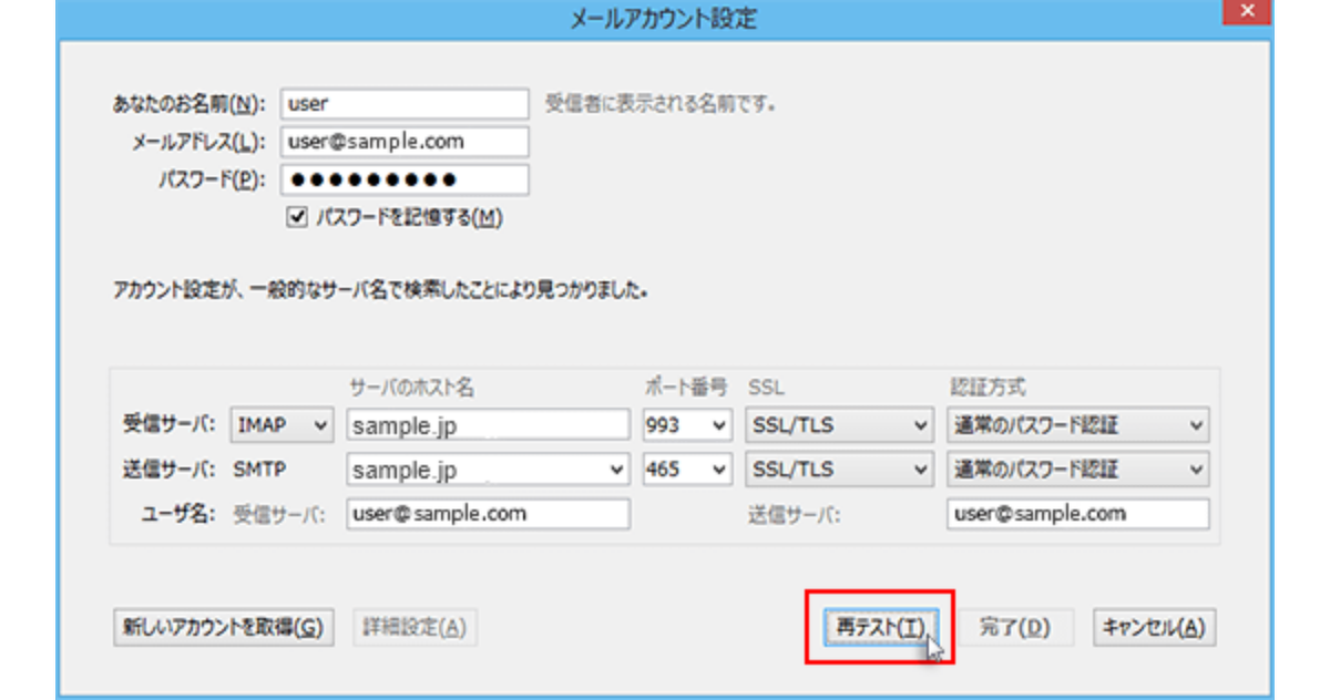 ポート番号など、入力項目の内容を今一度ご確認の上、問題がなければ画面右下の「再テスト」をクリックします。