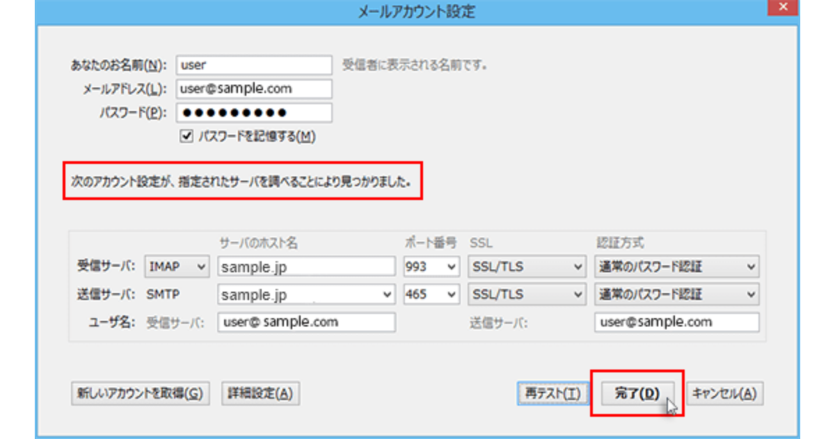 「次のアカウント設定が、指定されたサーバを調べることにより見つかりました。」の表示を確認し、 画面右下の「完了」をクリックしてください。