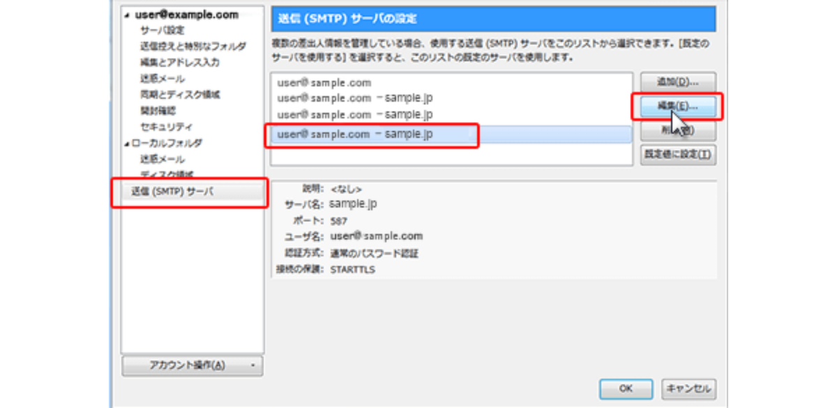 アカウント設定が表示されます。「送信(SMTP)サーバ」をクリックし、該当のメールアカウントに利用している サーバーを選択後、「編集(E)」をクリックします。