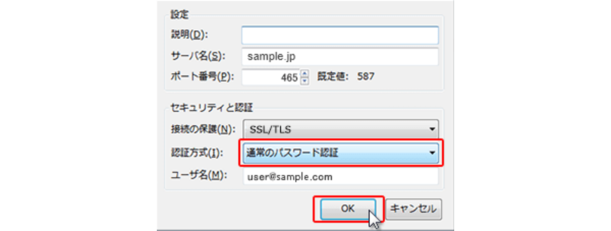 「認証方式(I)」の項目の「通常のパスワード認証」を選択し、「OK」をクリックします。