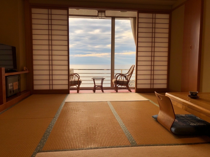 大浴場のセッティング中。 窓の向こうは日本海が広がっています。