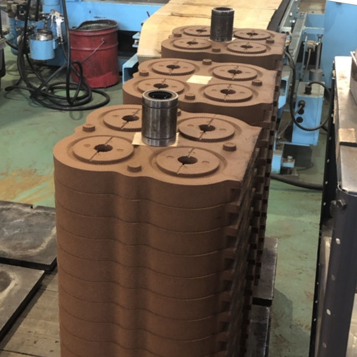 一方、燕シェルサービス様で専門とされているシェルスタック方式は、写真のように砂型を重ねて金属を流すことができ、省スペースで、かつ一度に多くの鋳物製品を生産することができる大変効率の良い生産方法です。