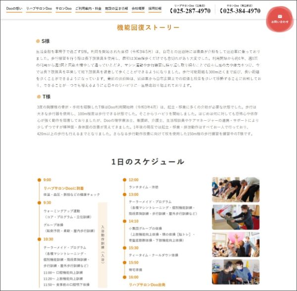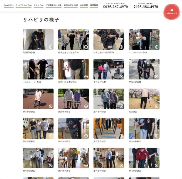 また、初めてホームページをご覧になる方が「Doo」グループのサービスをイメージしやすいように、利用者様の声や利用の流れを紹介した他、ギャラリーページにリハビリや各種イベントの写真を多数掲載して、ビジュアルで過ごし方や施設内の様子を知っていただけるようになっています。