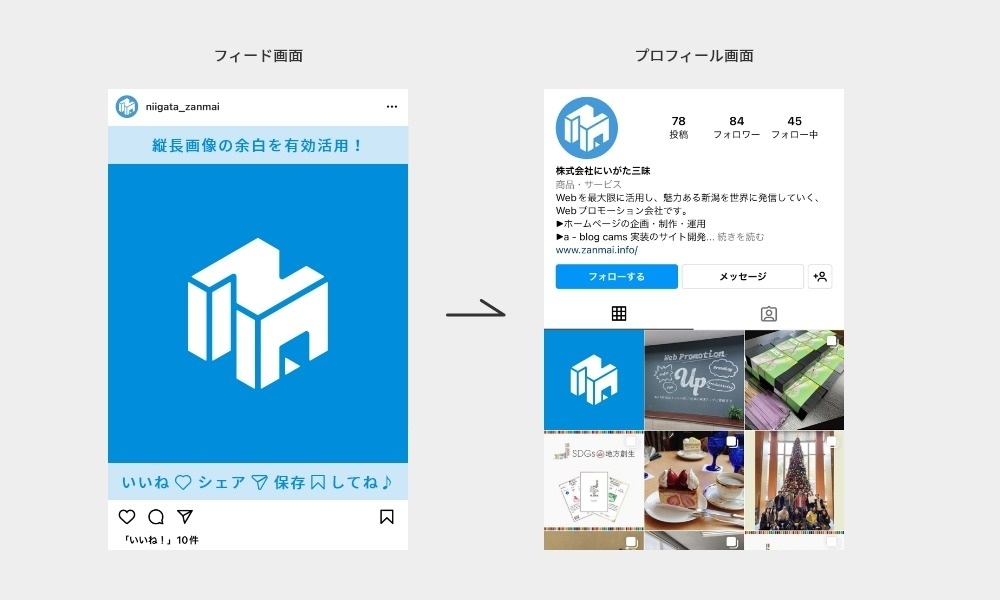 セール情報などを投稿画像に入れたいけど、プロフィール画面には表示させたくない…というときはこの余白部分を有効に使いましょう。