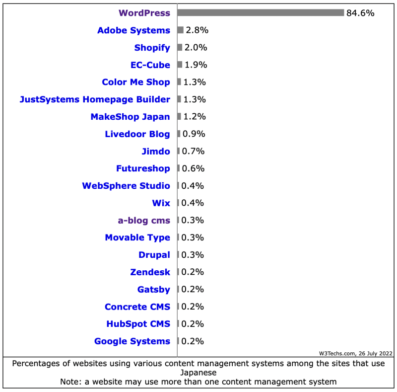 WordPressは、まだまだ84.6%と圧倒的なシェア率を誇っていまね。(2022年7月現在)