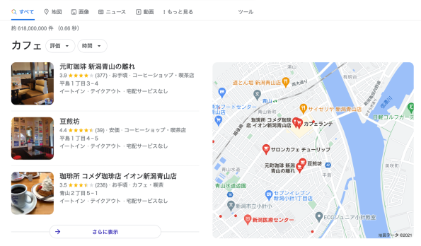 それに対して、特定の店舗や場所などを検索するローカル検索になると、そのニーズに関連するホームページではなく、Googleマイビジネス情報が地図と共に表示されます。