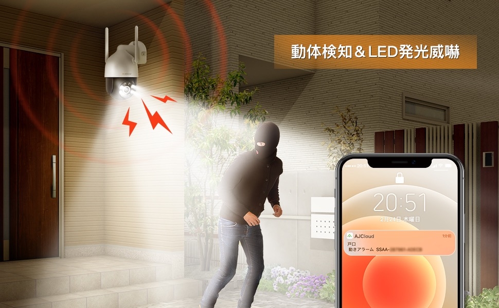 夜間侵入(スケジュールされた時間帯)があると、センサーが機能しLEDライトが点灯し、専用アプリに通知してくれる。