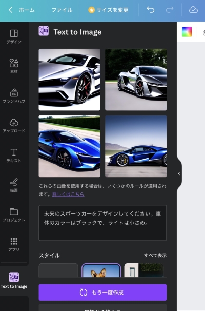 しかし「画像生成AI」という言葉を聞くようになった時には、もうすでにその技術は発達しており、プロンプトを入れて作られた車のイラストを見た時に、その完成度の高さに驚きました。