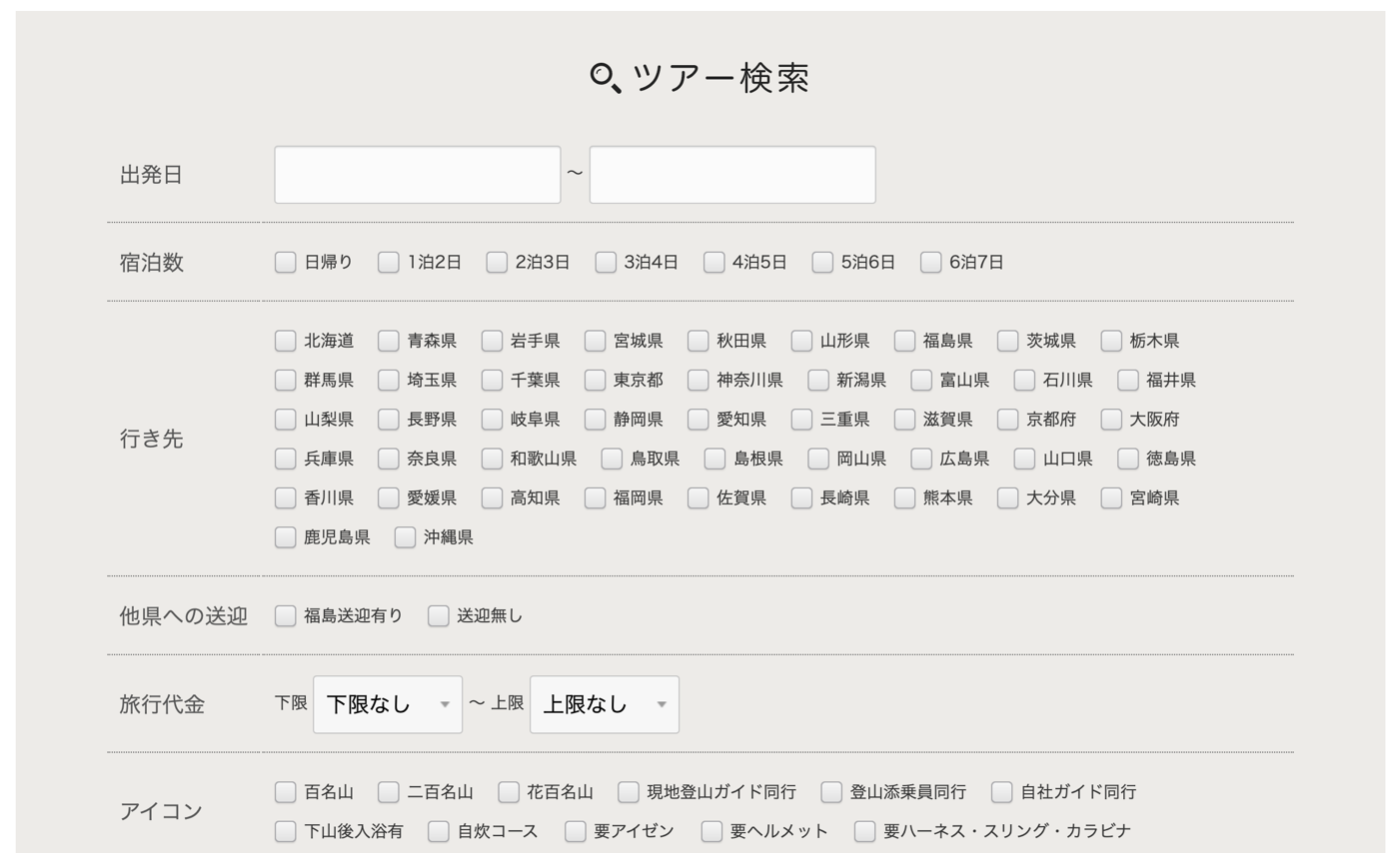 以下は、登山ツアーサイト「トラマス 山旅」で取り付けた検索項目です。
