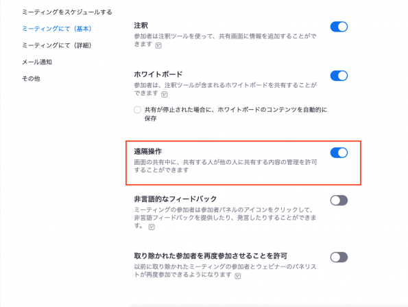 手順としては、まず管理画面のミーティングの詳細にて「遠隔操作」がONになっている必要があります。