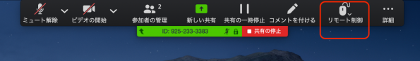 そして、 zoomの操作パネルが上部に出てくると思いますが、右側にある「リモート制御」のアイコンをクリックしてもらいます。