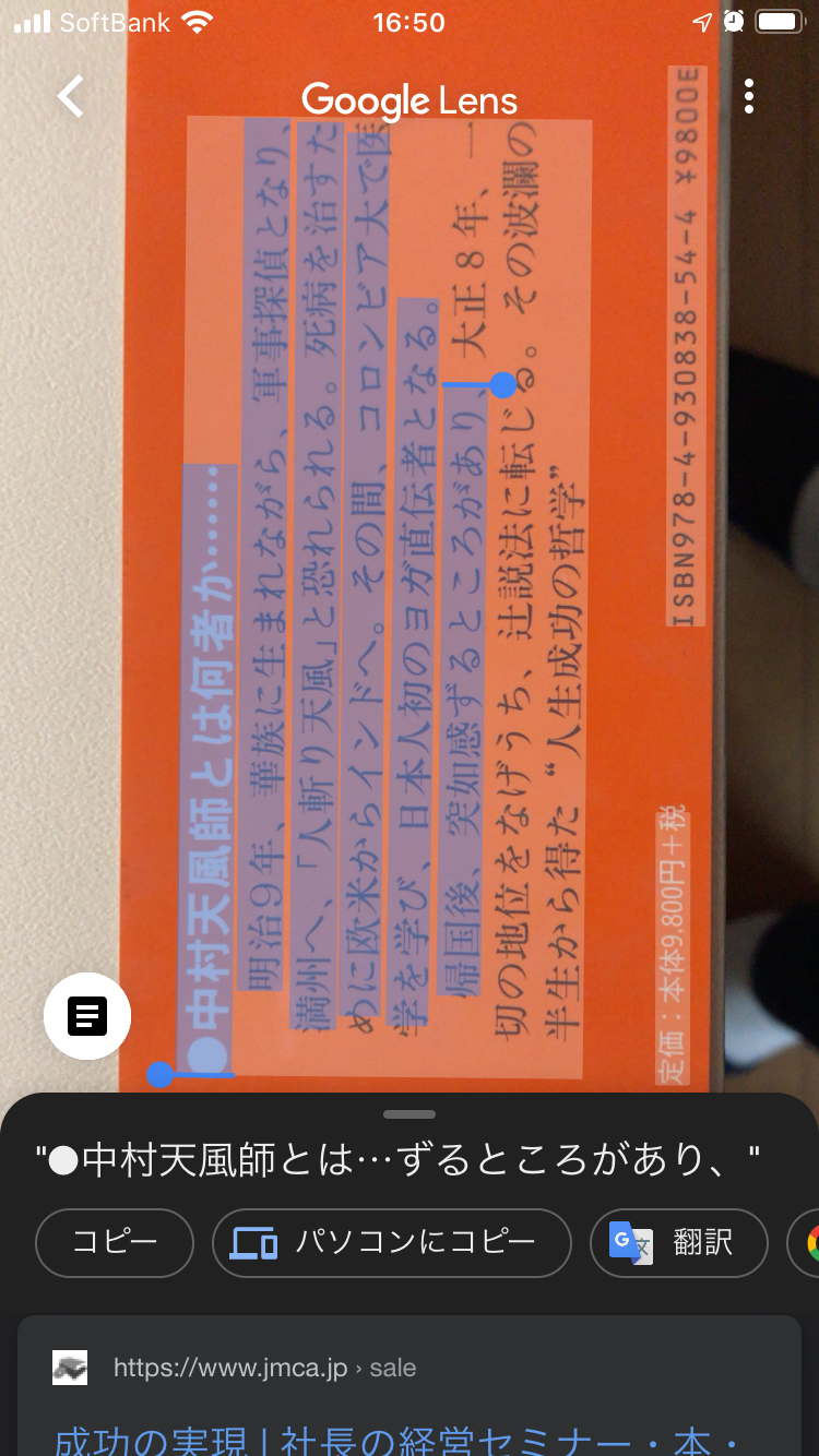 すごいのは、その際に「テキスト」のアイコンにしておくと、写真を撮らなくても、写している状態でテキスト部分のどこから、どこまでというように選択ができるのです。