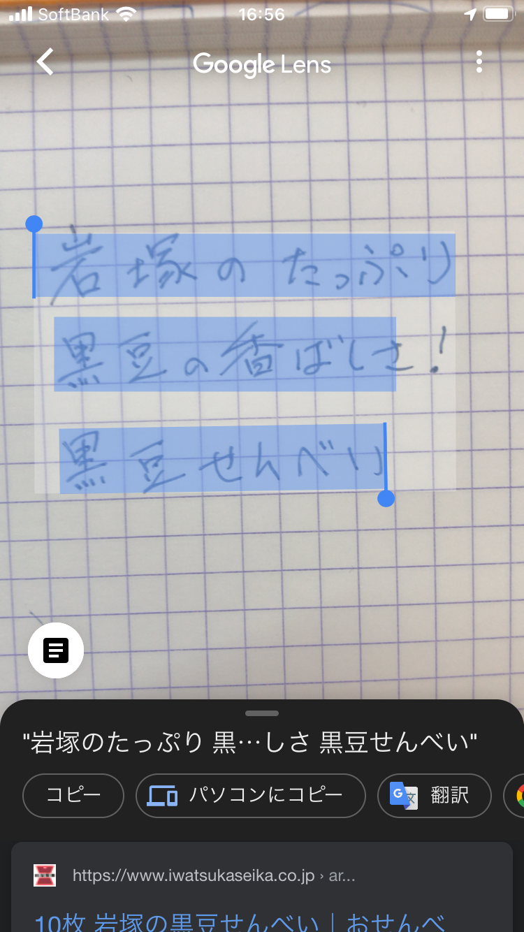「Googleレンズ」も同じように、「Google」アプリを起動して「Googleレンズ」のアイコンをクリックし、スマホのカメラで印刷されたものを写します。