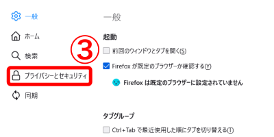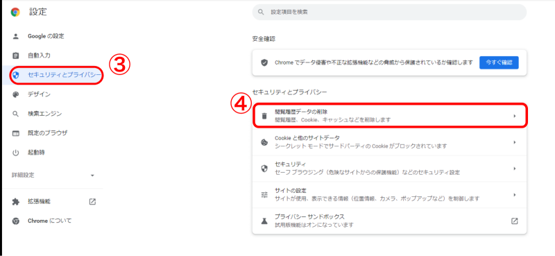 3. 「セキュリティとプライバシー」(③)内の「閲覧履歴データの削除」(④)をクリック
