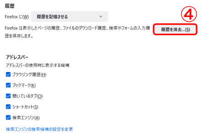 3. 「プライバシーとセキュリティ」(③)内の「履歴」の「履歴を消去...(S)」をクリック