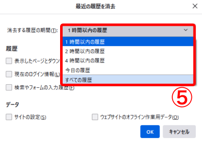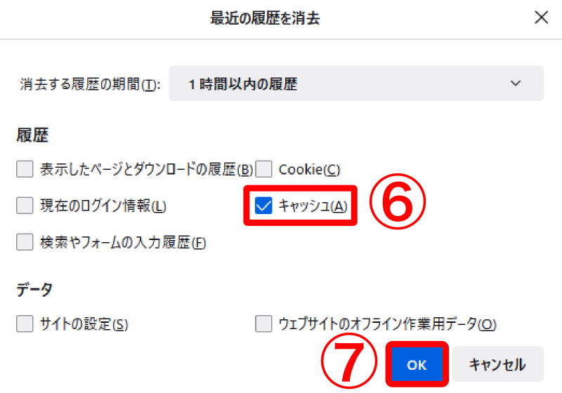5. 履歴の「キャッシュ」(⑥)をチェックし、「OK」(⑦)をクリック