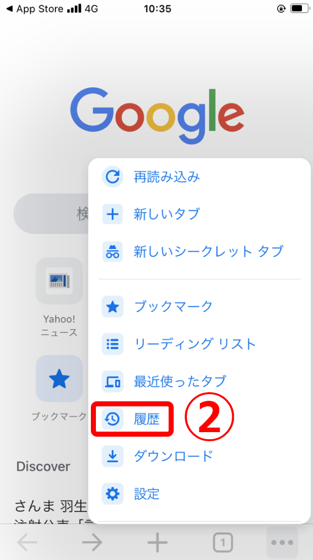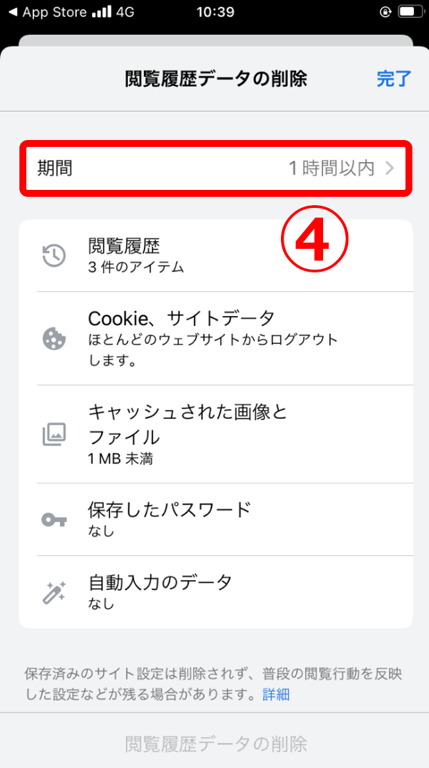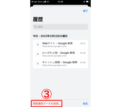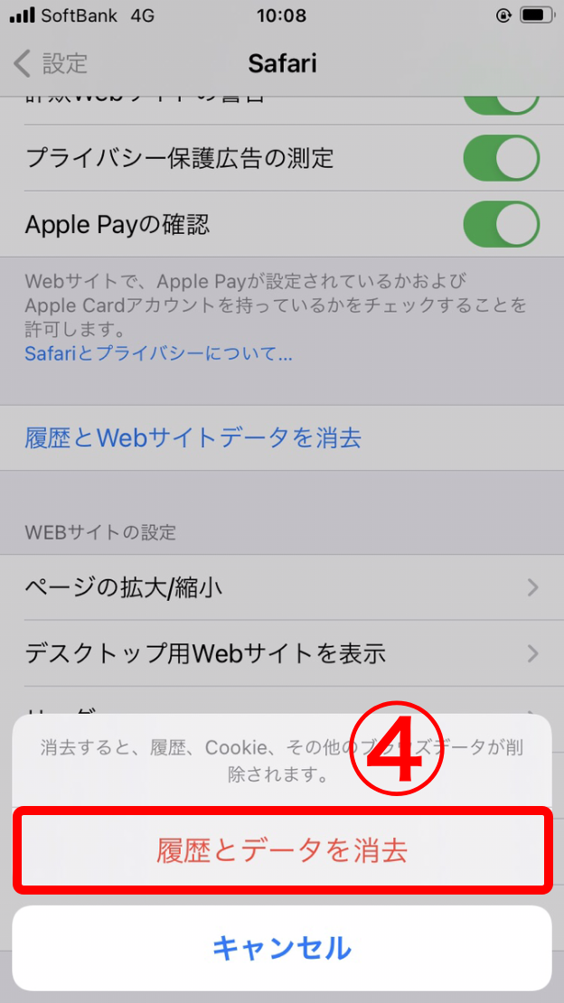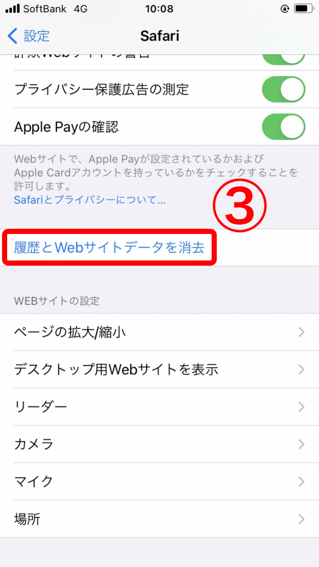 3. 「履歴とWebサイトデータを消去」(③)をタップ