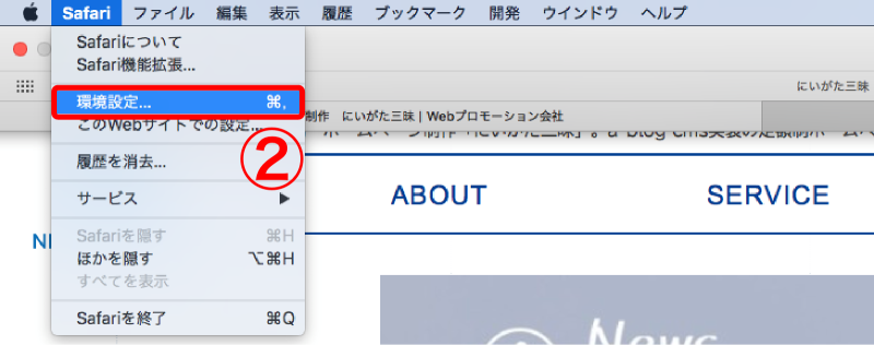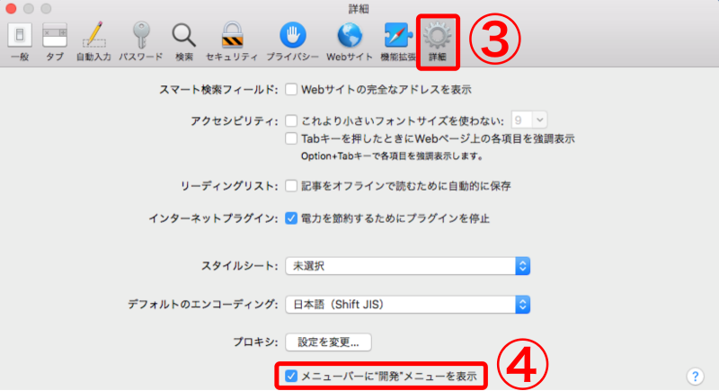 3. 「詳細」(③)内の「メニューバーに”開発”メニューを表示」(④)をチェック