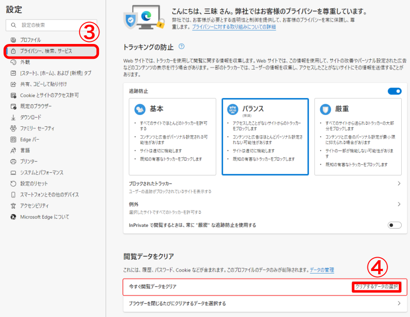 3. 「プライバシー、検索、サービス」(③)内の「今すぐ閲覧データをクリア」の「クリアするデータの選択」(④)をクリック