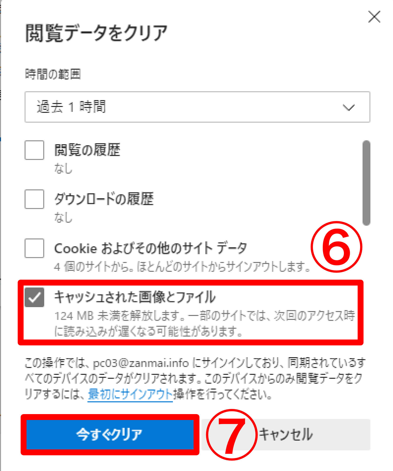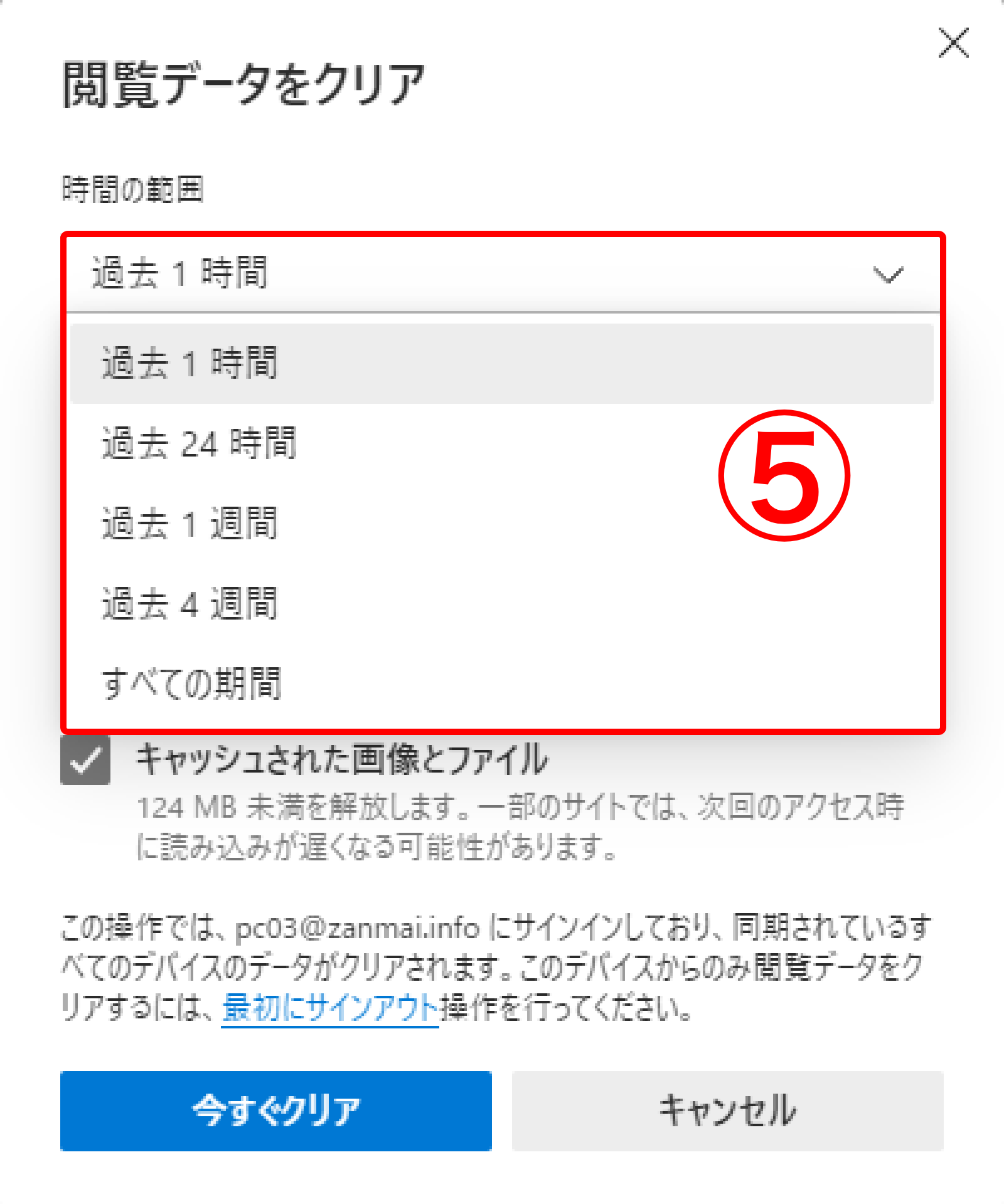 4. 時間の範囲を選択(⑤)し、「キャッシュされた画像とファイル」(⑥)をチェック