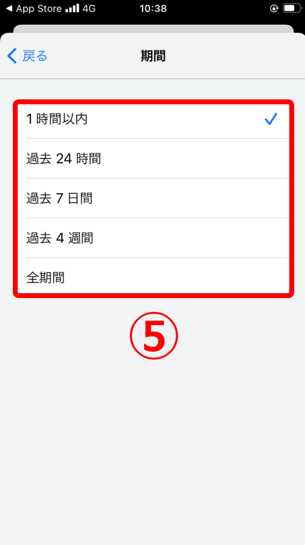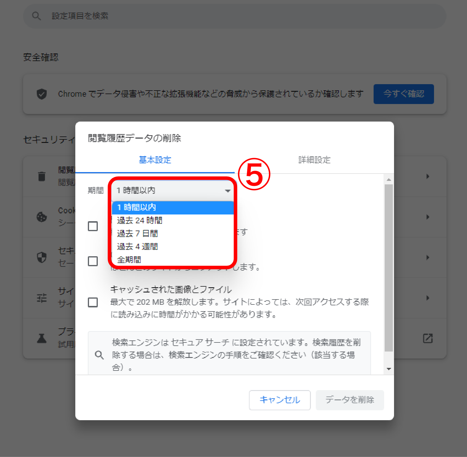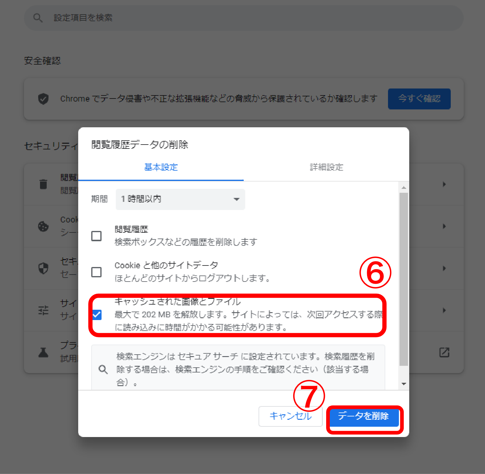 4. 期間を選択(⑤)し、「キャッシュされた画像とファイル」(⑥)をチェック