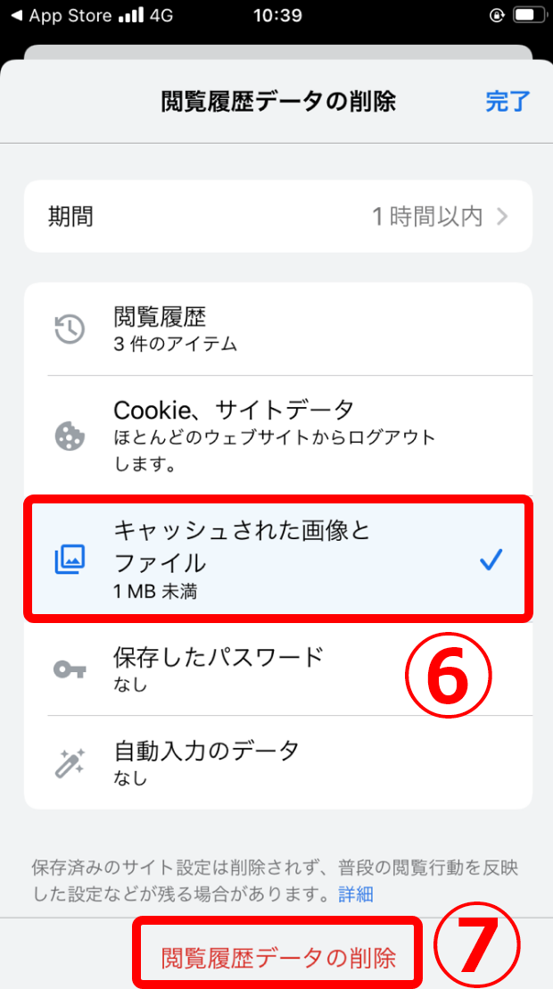 5. 「キャッシュされた画像とファイル」(⑥)をチェック