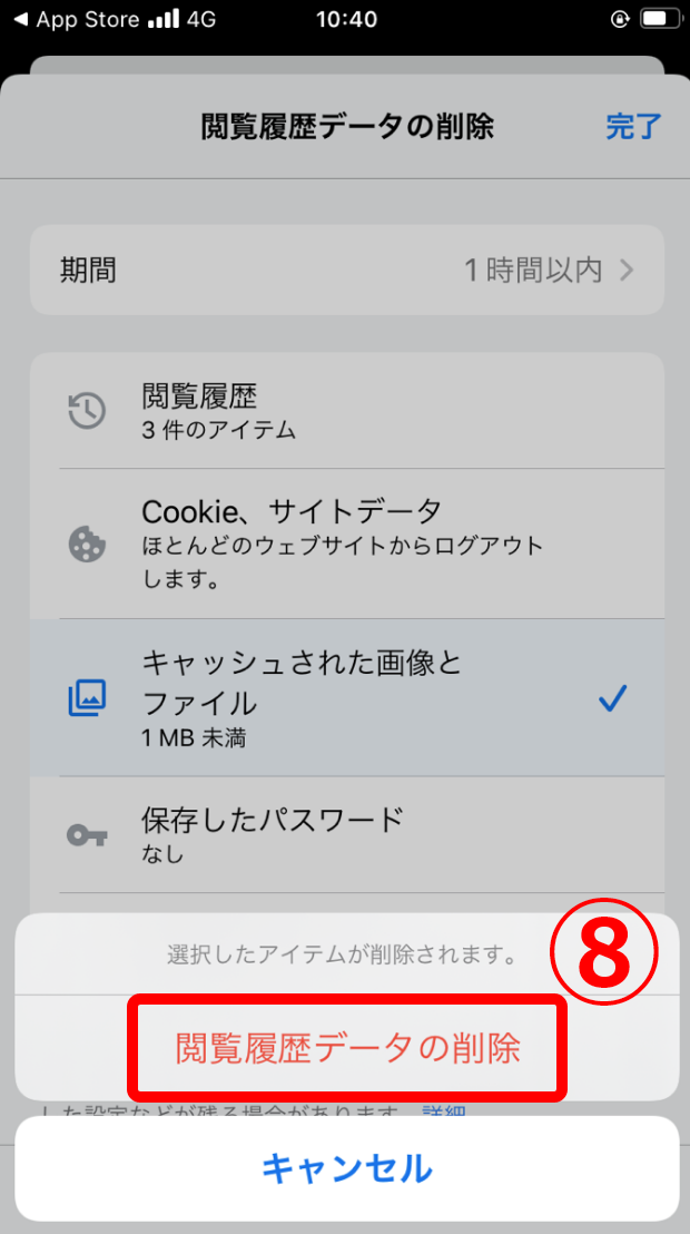 6. 「閲覧履歴データの削除」(⑦)→もう一度「閲覧履歴データの削除」(⑧)をタップ