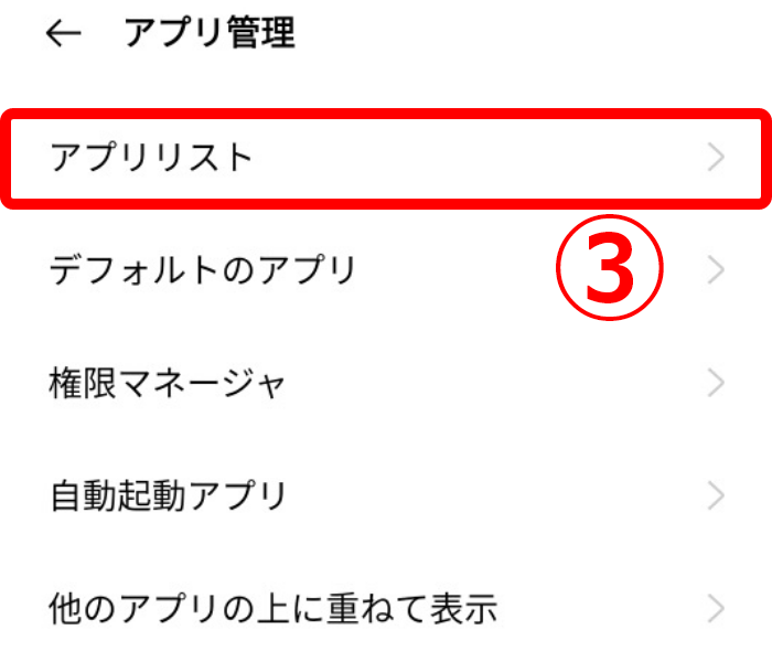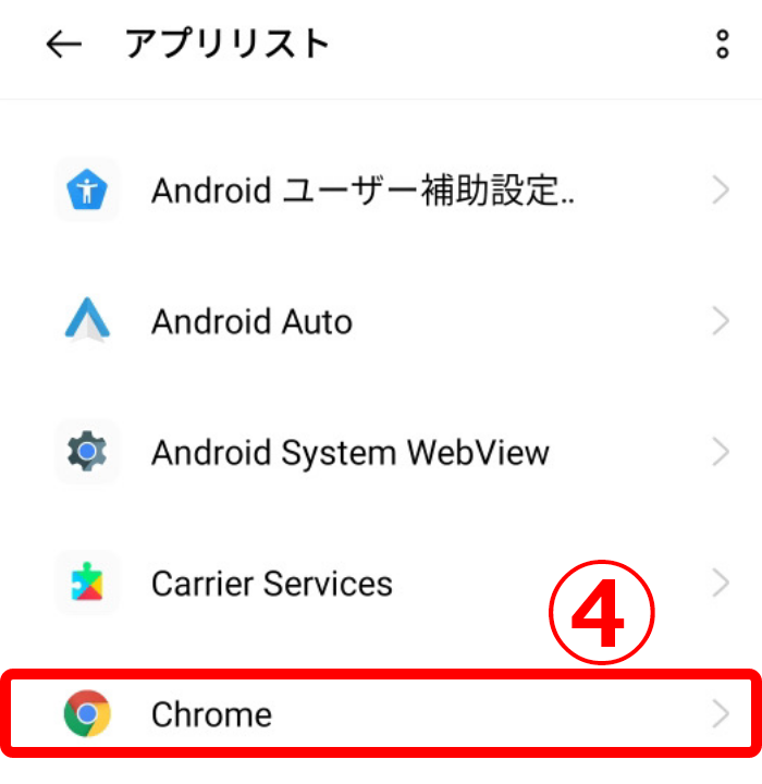 3. 「アプリリスト」(③)→「Chrome」(④)をタップ