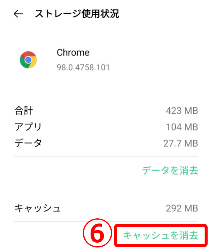 4. 「ストレージ使用状況」(⑤)→「キャッシュを消去」(⑥)をタップ