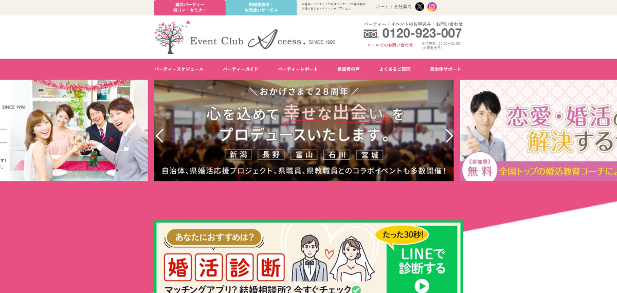 「本当の自分を知ることで、相手を見つける」というコンセプトのもと、安心して将来のパートナーを見つけることができる結婚相談所「ハイグレードクラブ」、どなたでも気軽に参加できる婚活イベント「アクセスパーティー」、婚活が上手くいくようになる「恋愛婚活のお悩みを解決するスクール」を運営。