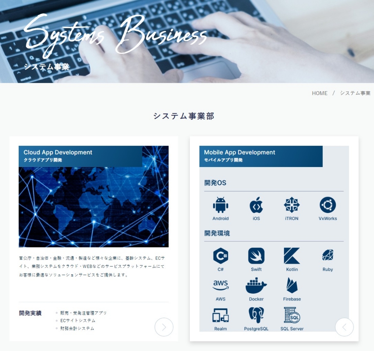 例えば、システム事業の紹介では、概要・開発実績が書かれたカードをクリックすると、反転して開発環境がわかるようになっています。開発事例を紹介するページでは、スクロールするとコンテンツが表示されてくるモーションがついており、洗練された印象になりました。リニューアルしたホームページを社員もとても気に入っています。