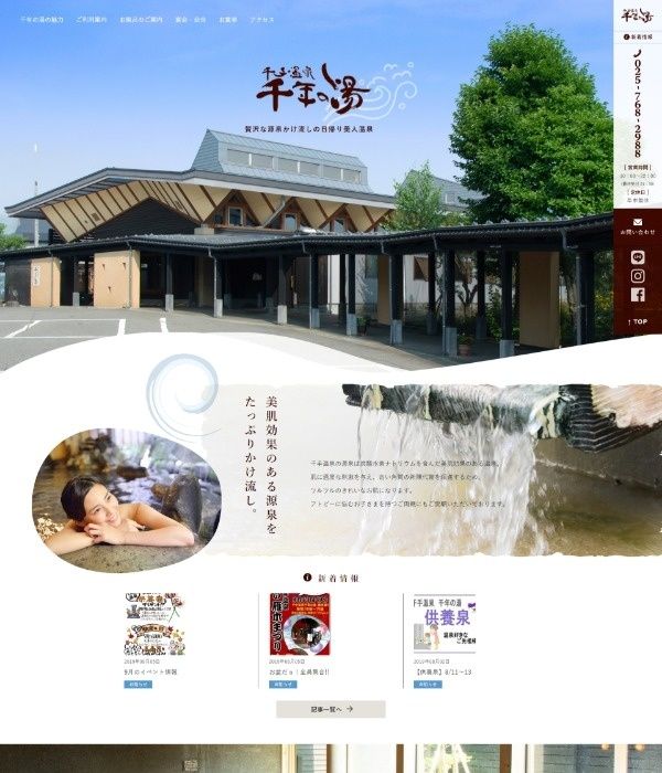 豊富な湯量で源泉かけ流し、美肌になると評判の「千手温泉 千年の湯」様のホームページ制作をいたしました。