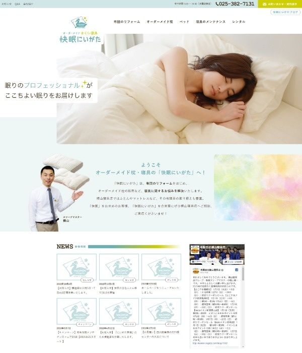 新潟市を中心に複数店舗を構える「横山寝具店」様の公式ホームページリニューアルをいたしました。「快眠にいがた」ブランドでオーダーメイドまくらなどの寝具全般を提供することで、上質な睡眠のお手伝いをしていらっしゃいます。癒しのイメージを淡い色合いでまとめて、穏やかで優しい雰囲気に仕上げました。