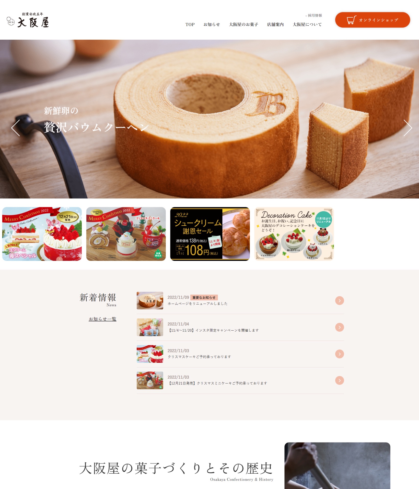 新潟県内に多店舗展開されている和洋菓子店の株式会社大阪屋様の公式ホームページを制作しました。