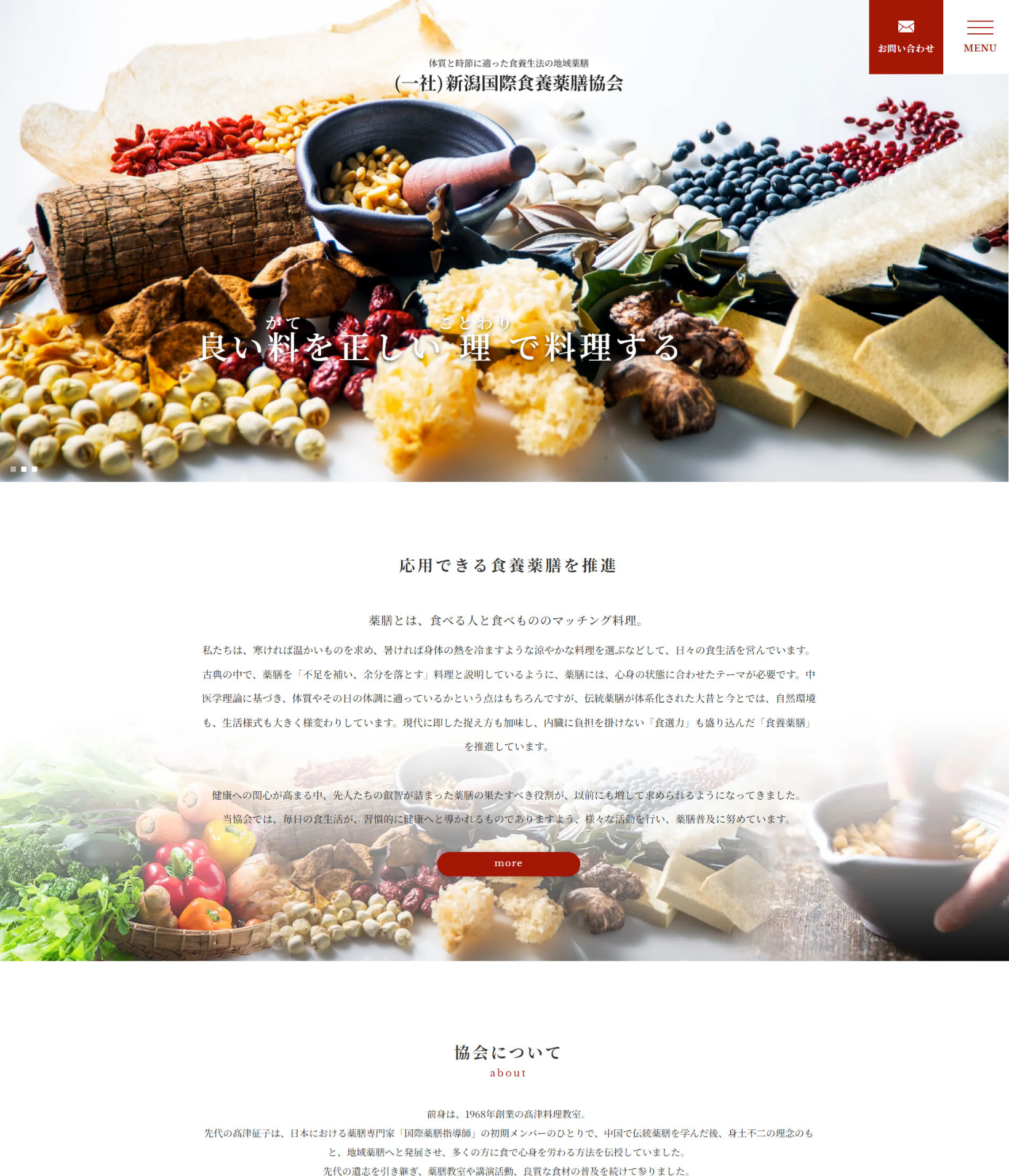 薬膳に使用される食材の画像をメインに全体的に落ち着いた色合いで、シンプルな構成でまとめました。講座案内・料理教室ページなどの料理画像は簡単に差し替えることができるので、季節感のあるメニューでアピールすることが可能です。