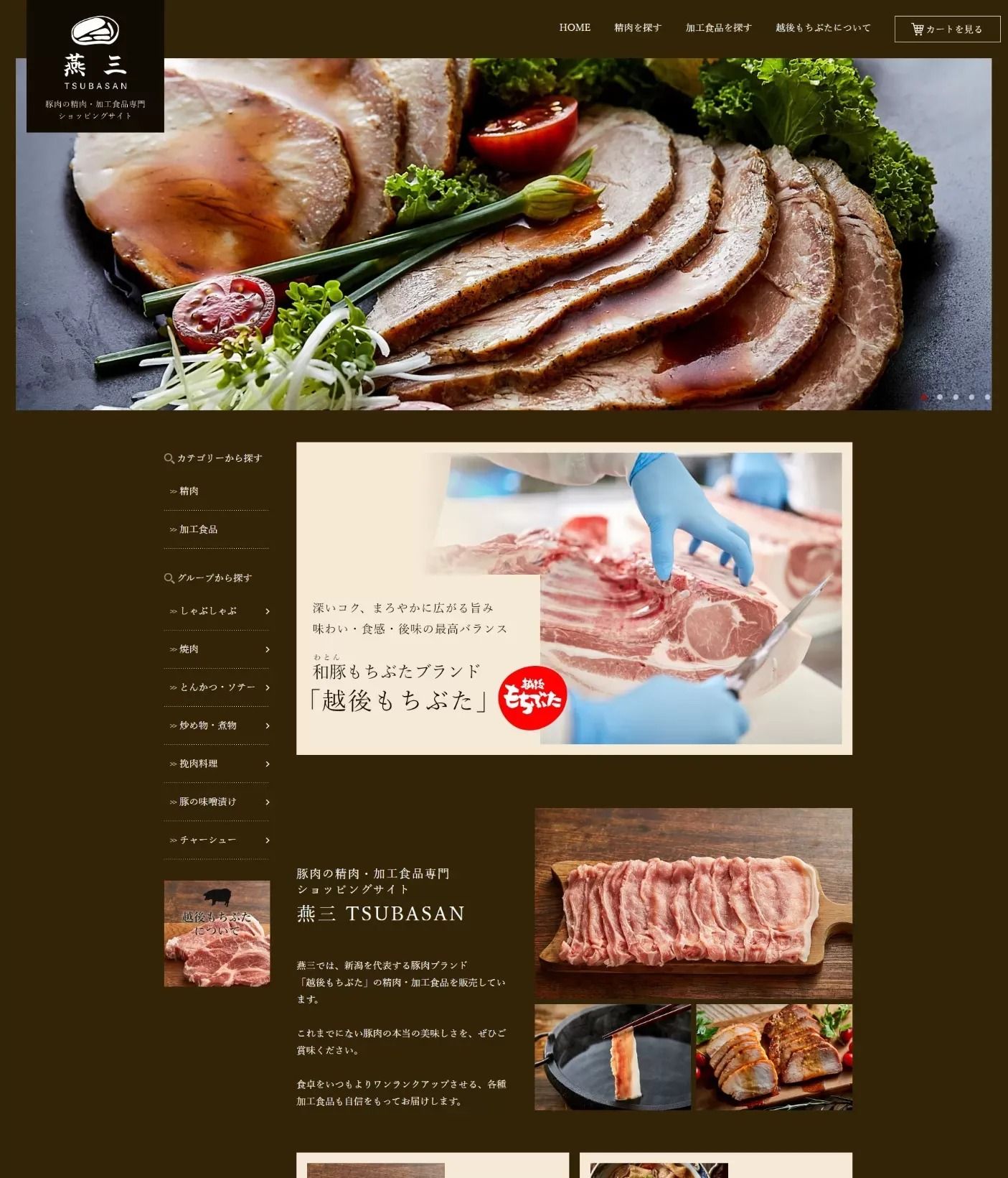 「越後もちぶた」についてのページでは、おいしさの特長や自社工場での安心加工を解説し、ブランディングの役割も持たせています。